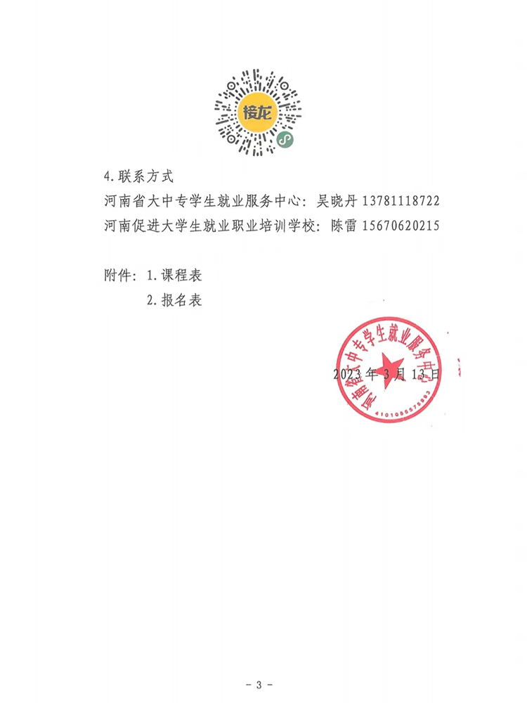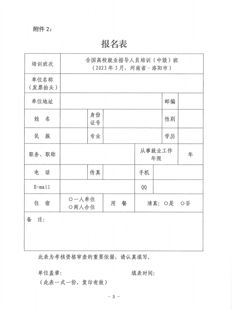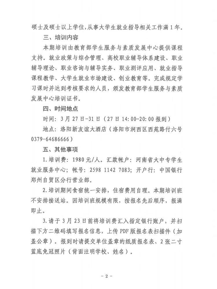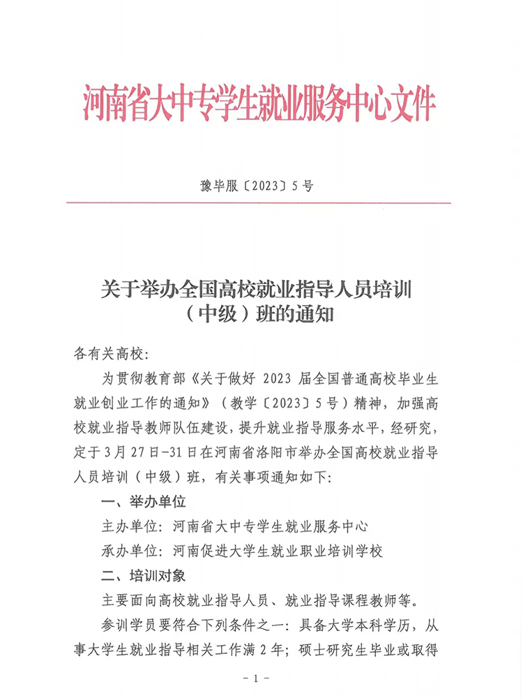 豫毕服〔2023〕5号关于举办全国高校就业指导人员培训(中级)班的通知(2023-04-24)